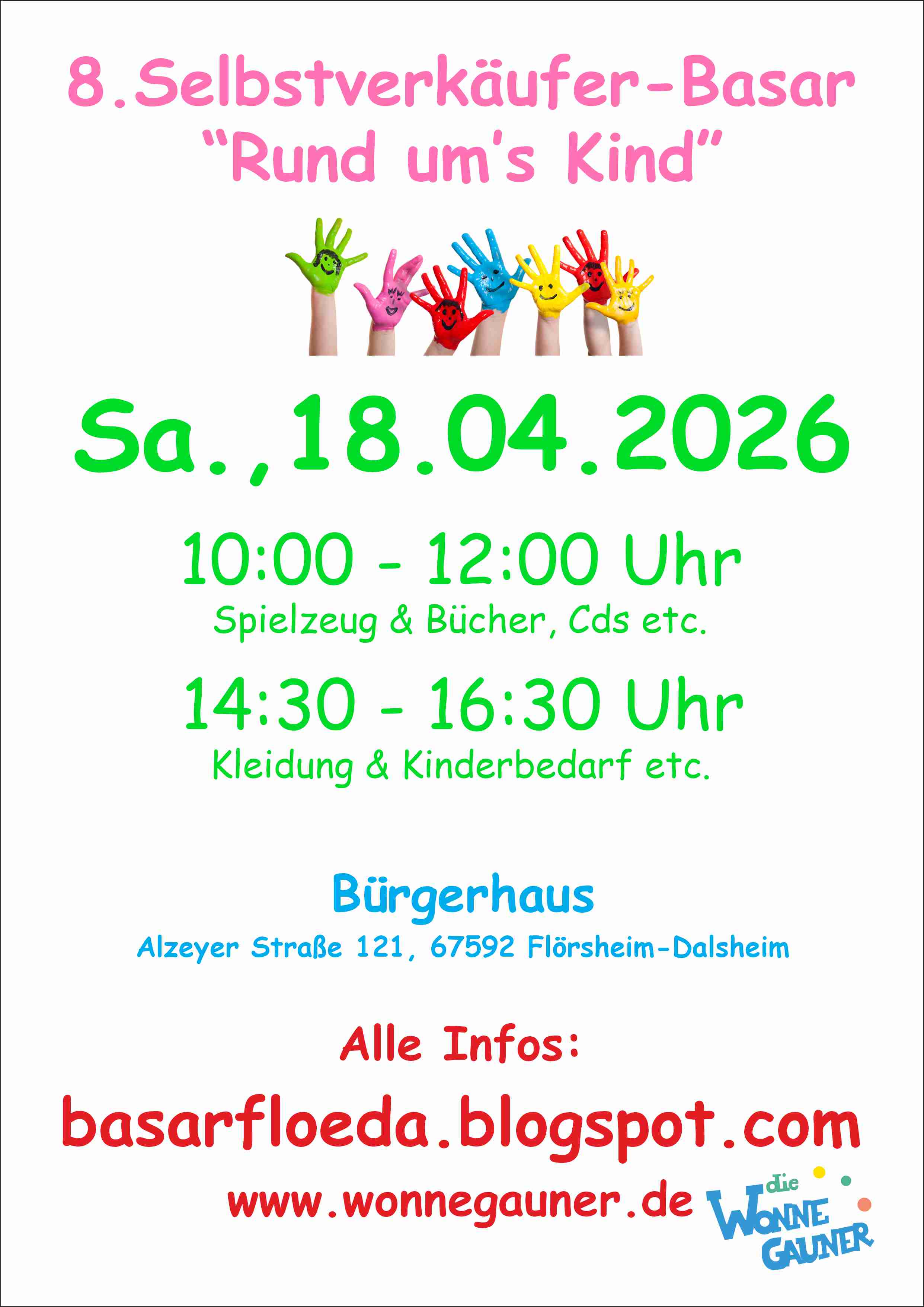 Die "Wonnegauner e.V." und das BasarTeam Flörsheim-Dalsheim laden Sie herzlich ein und freuen sich auf einen erfolgreichen Basar!